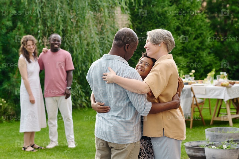 Счастливая межкультурная зрелая пара обнимается со своим милым внуком