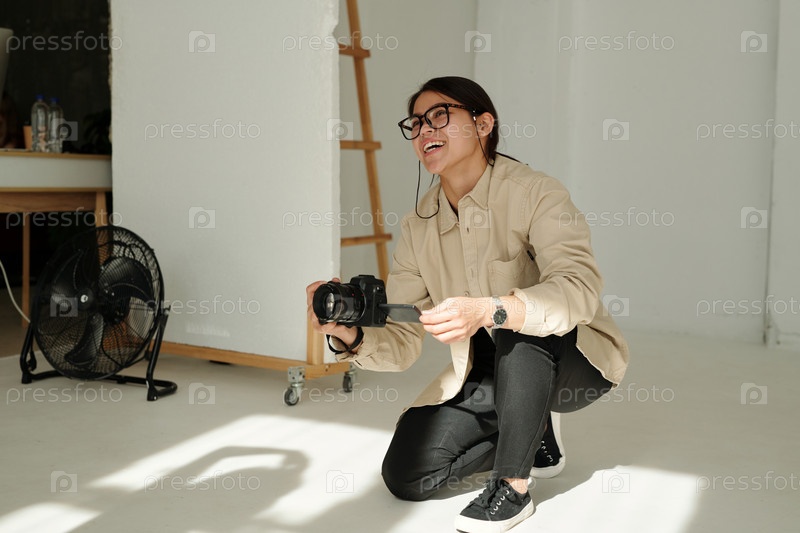 Счастливый молодой фотограф с фотоаппаратом общается с моделью