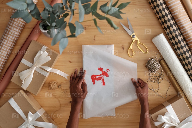 Руки девушки, упаковывающей подарок в бумагу