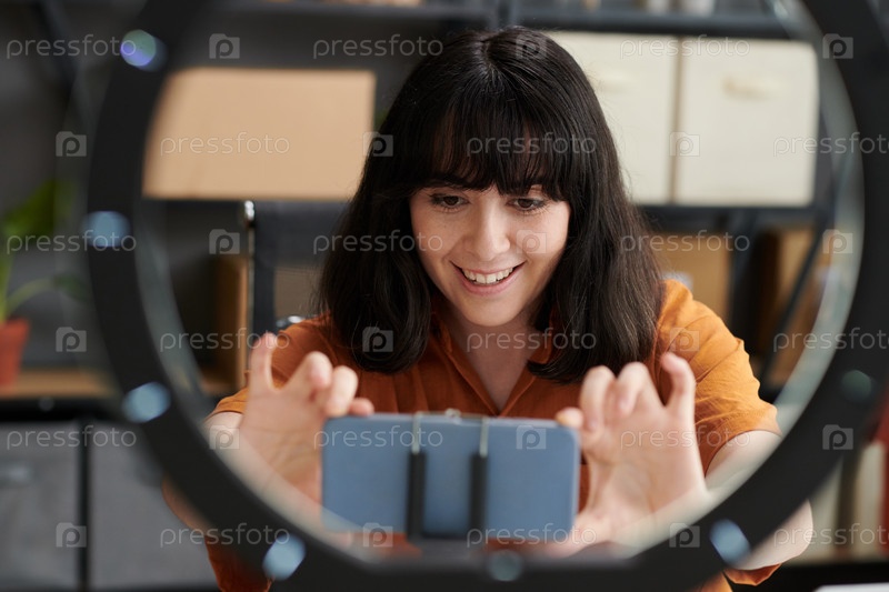 Сосредоточьтесь на лице красивой брюнетки-блогерки, регулирующей камеру смартфона