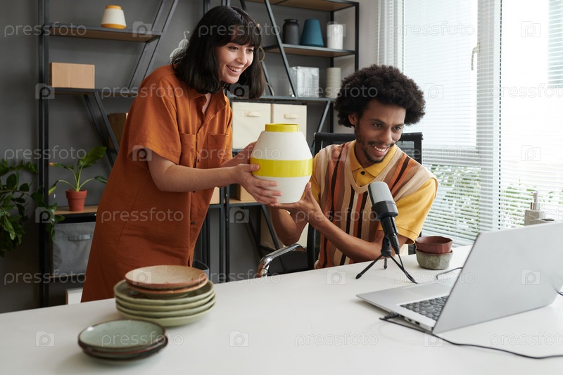 Молодой человек принимает микрофон, показывая новую керамическую вазу ручной работы