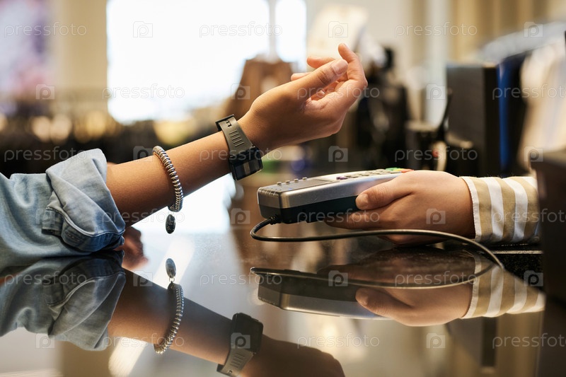 Женщина-клиент делает оплату с помощью Smartwatch