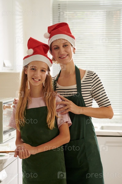 Улыбающаяся мать и дочь в шляпах Санта-Клауса