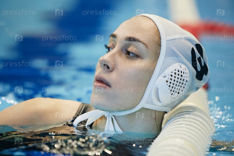 Молодая отдыхающая игрокка водяного поло в плавательной шапке