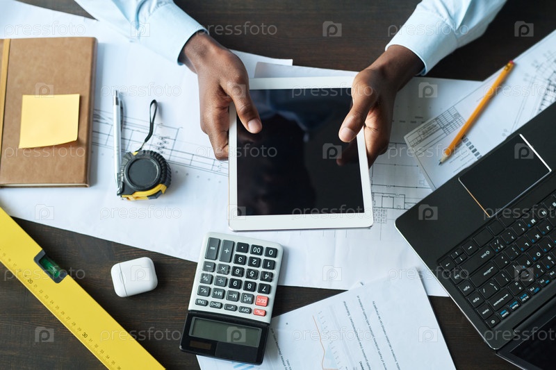 Над углом рук молодого бизнесмена с планшетом, сидящего у рабочего места