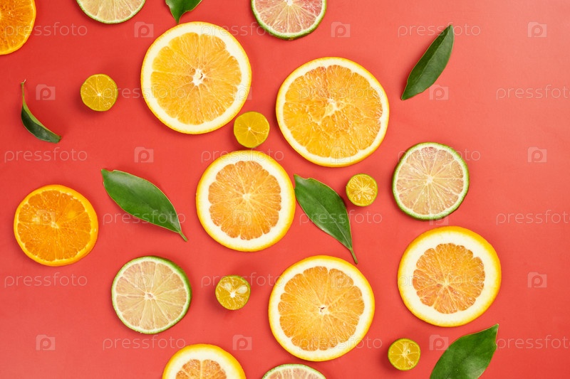 Цитрусовые фрукты и листья на красном фоне