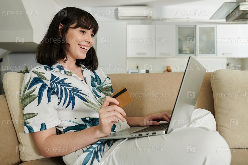 Молодая веселая брюнетка с кредитной картой смотрит на экран ноутбука