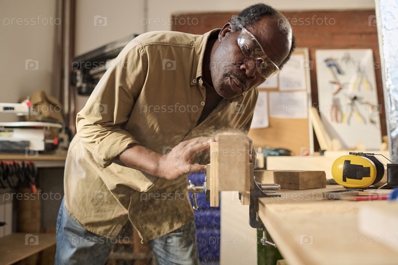 Старший чернокожий плотник выдувает плуг с деревянной доски