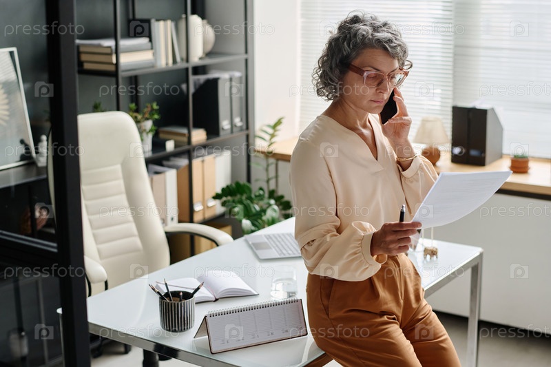Серьезная деловая женщина с финансовой бумагой, разговаривающая по мобильному телефону