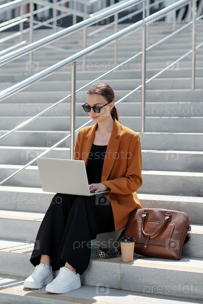Молодая серьезная бизнес-леди в солнцезащитных очках и тихом роскошном наряде с помощью ноутбука
