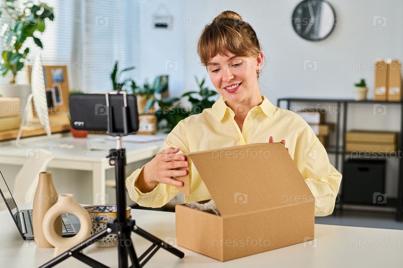 Молодая улыбающаяся блогерка открывает картонную коробку с новой вазой