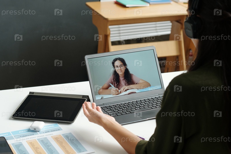Экран ноутбука с симпатичной школьницей, слушающей объяснение учителя