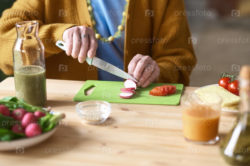 Женщина режет овощи для салата