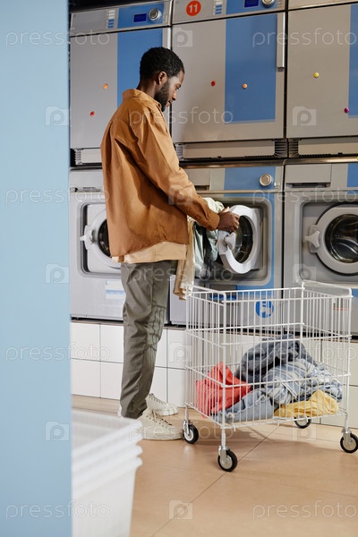 Длинный снимок молодого афроамериканца, кладущего одежду в машину