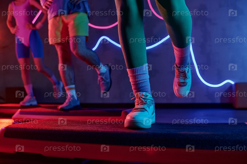 Посетители тренажерного зала тренируются на ступенчатых платформах