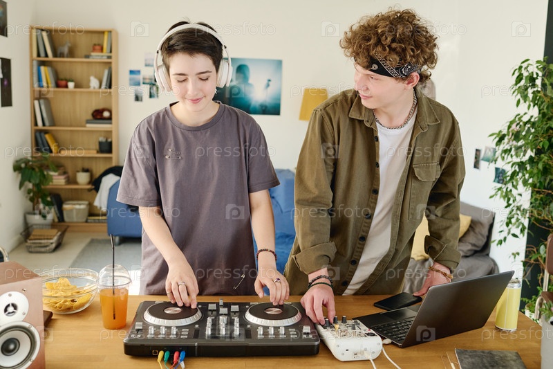 Подросток в повседневной одежде смотрит на свою девушку, регулирующую проигрыватели