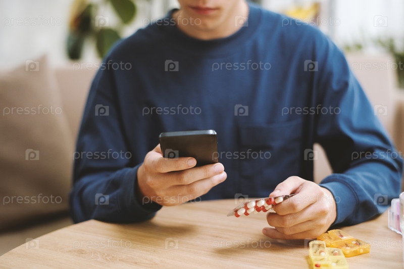 Мужчина читает медицинские противопоказания онлайн, прежде чем говорить о таблетках