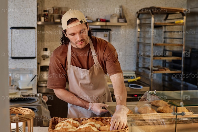 Пекарь устраивает свежие кондитерские изделия на виккерной подносе для продажи в кафе