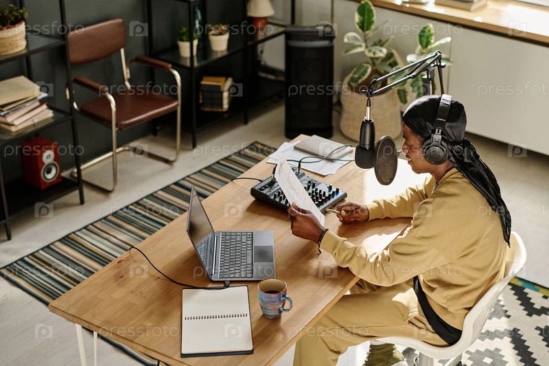 Выше угол афроамериканского парня, читающего текст на бумаге перед микрофоном