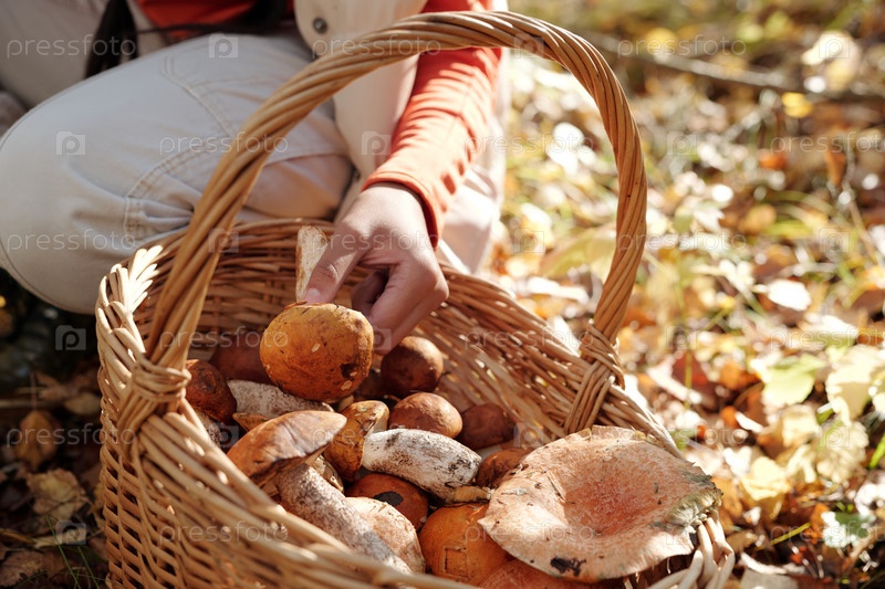 Рука молодой женщины, кладящей свежий гриб boletus в корзину