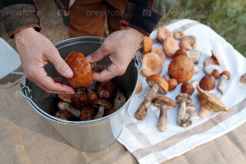 Руки молодого человека, моющего свежую оранжевую шапку boletus над металлическим ветром
