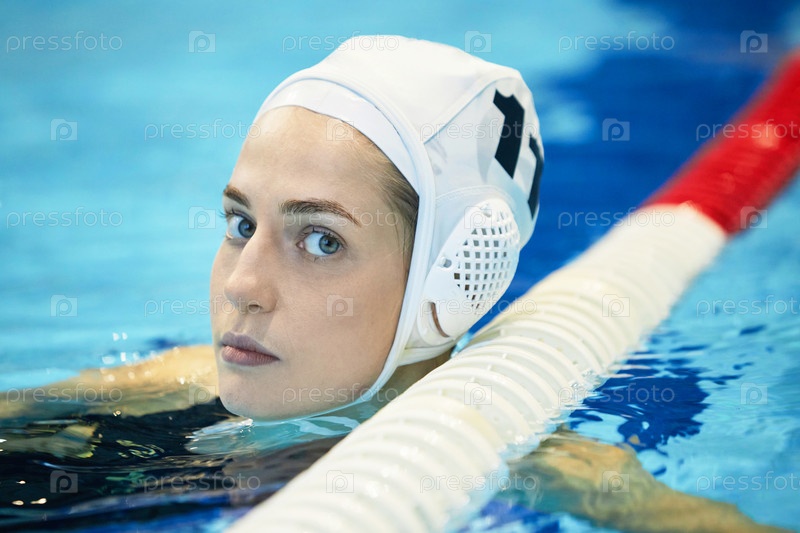 Голова молодой серьезной спортсменки в купальной шляпе, смотрящей на камеру
