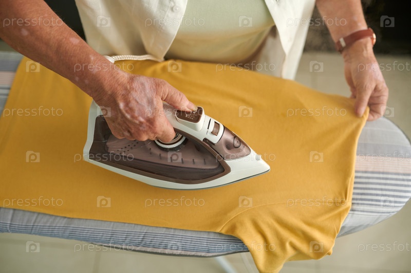 Старшая женщина гладить рубашку