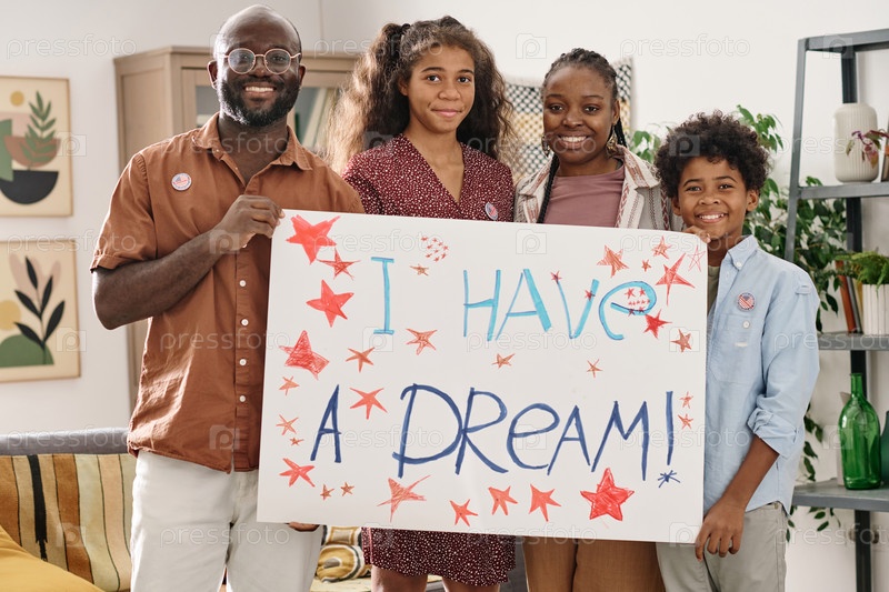 Семья, показывающая плакат 'У меня есть мечта'