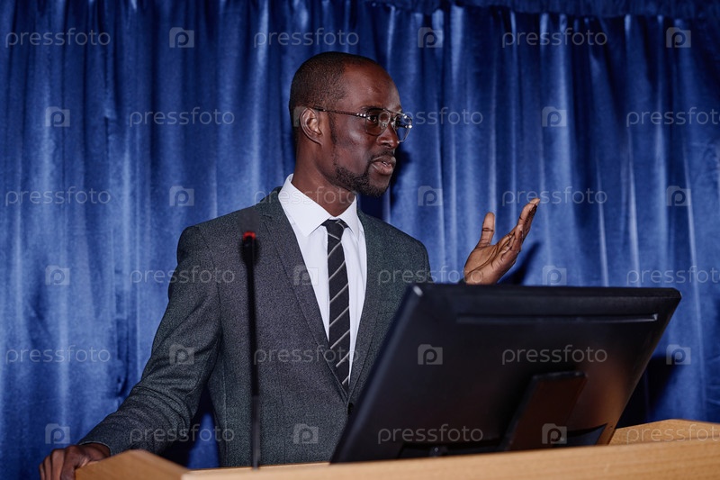 Бизнесмен, выступающий со своей речью на конференции