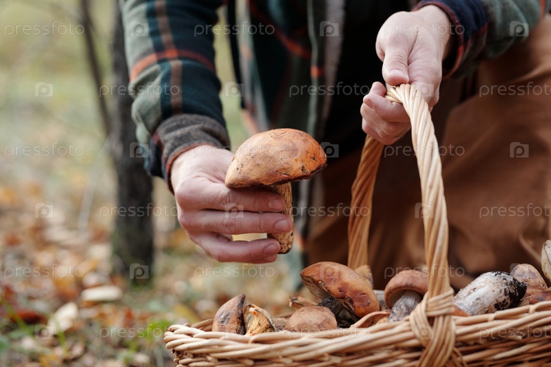 Focus on hand of young male mushroom picker holding orange cap boletus Сосредоточьтесь на руке молодого мужчины, собирающего грибы и держащего оранжевый кепка