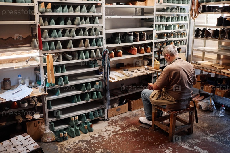 Задний вид зрелого мужчины в рабочей одежде, сидящего на стуле перед рабочим местом