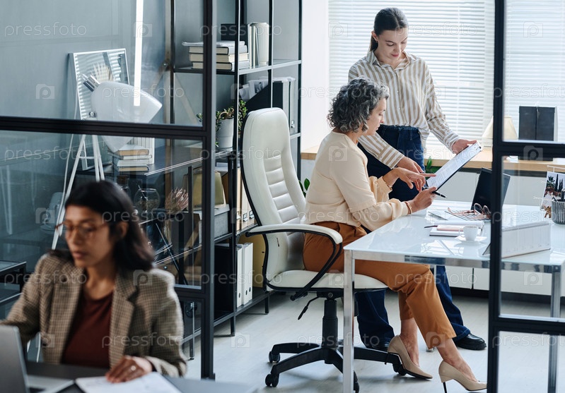Молодая секретарша объясняет взрослой женщине-хозяину моменты нового контракта