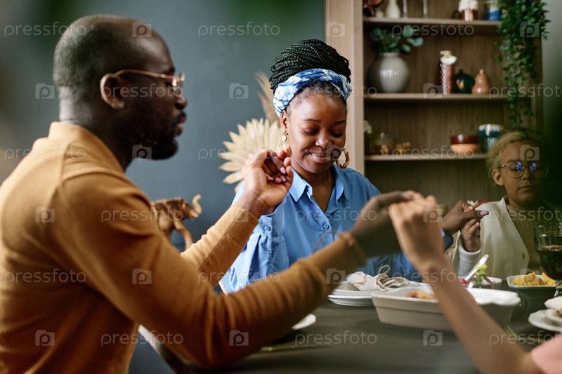 Счастливая молодая женщина, сидящая у стола между мужем и дочерью
