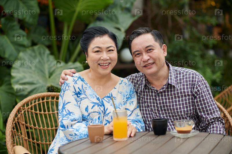 Улыбающаяся пожилая пара, сидящая за столом в кофейне