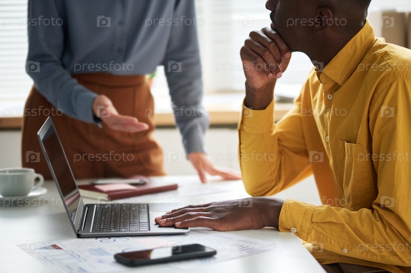 Молодой афроамериканский бизнесмен, держащий руку на сенсорном планшете ноутбука