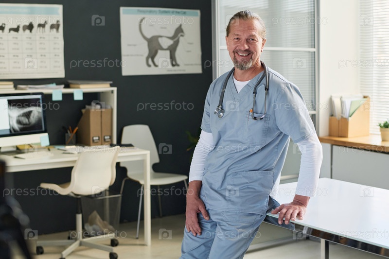 Ветеринар среднего возраста, стоящий в своем кабинете