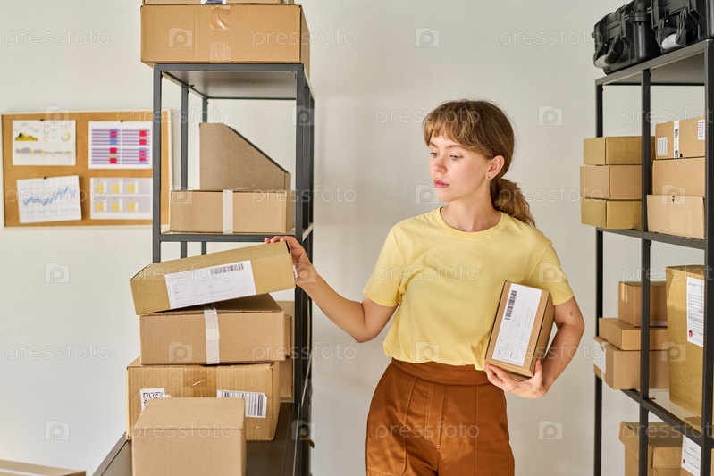 Молодая женщина-работница рынка или склада, стоящая у стойки