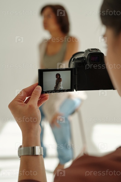 Фокус на экране фотоаппарата, удерживаемого молодой женщиной-фотографом