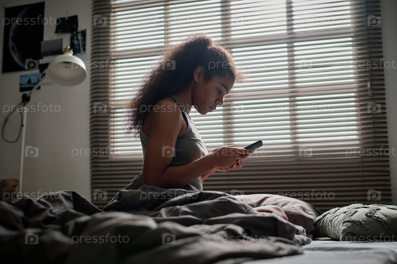 Боковой вид проблемной девочки-подростка, использующей смартфон во время сидения на кровати