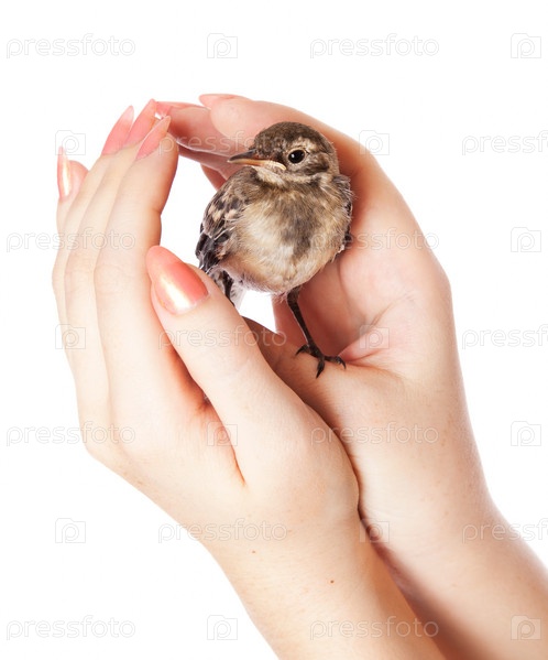 Птенец в руках крупным планом на белом фоне