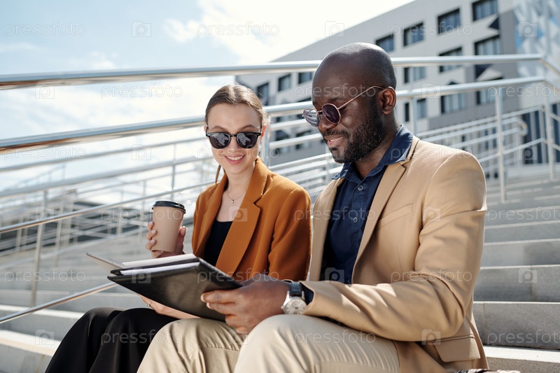 Два счастливых молодых межкультурных коллеги в тихом роскошном наряде обсуждают данные