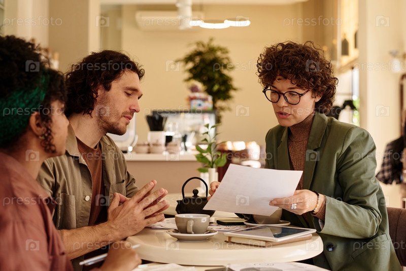 Коллеги внимательно анализируют документы в кафе