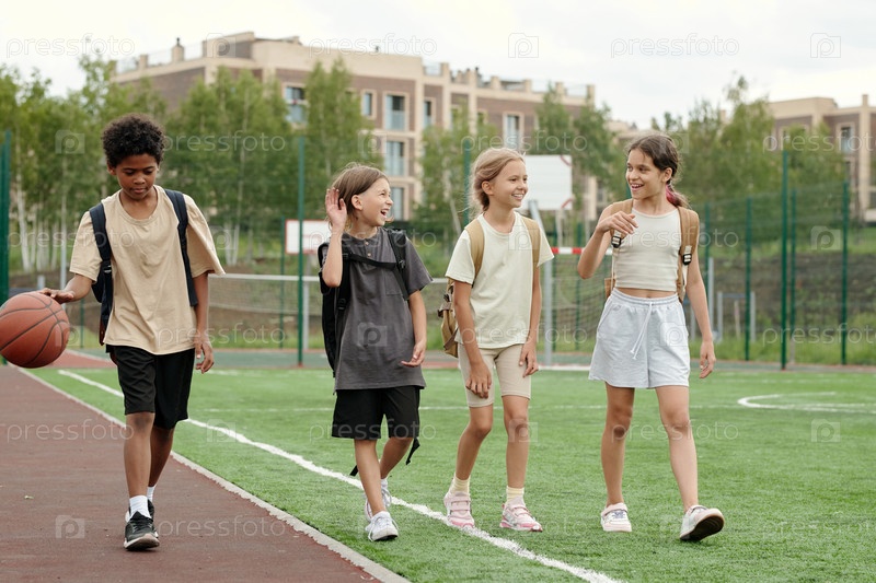 Три веселых школьника обсуждают что-то и смеются