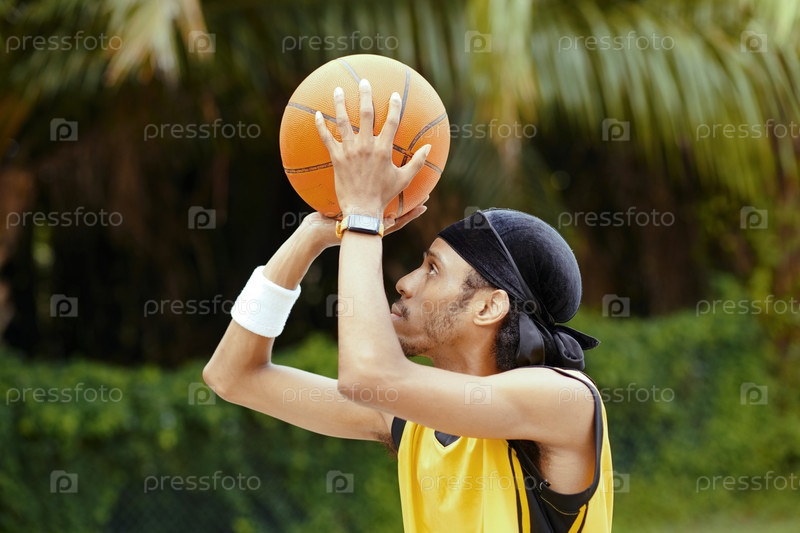 Черный мужчина играет в баскетбол на открытом воздухе,
