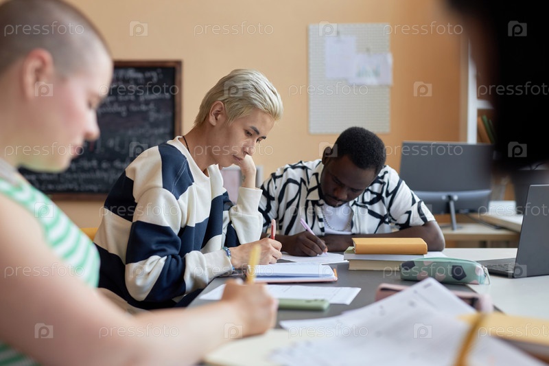 Сосредоточьтесь на двух молодых межкультурных студентах, которые проводят экзаменационный тест