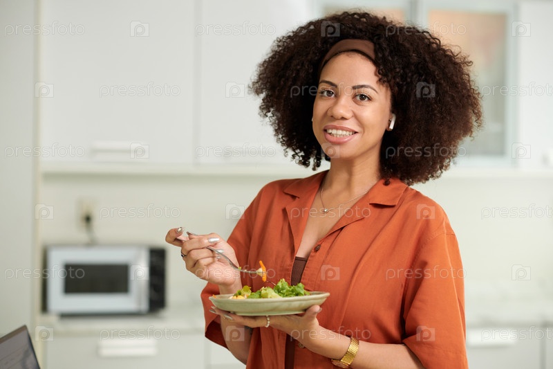 Улыбающаяся женщина ест салат из тунца