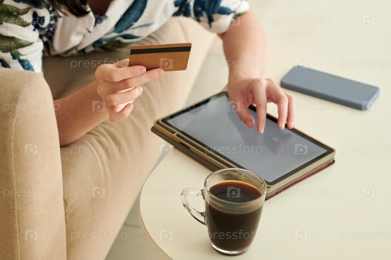 Руки молодой женщины, держащей кредитную карту и использующей планшет