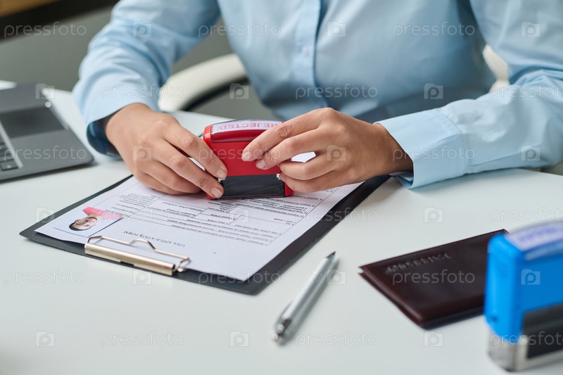 Специалист визового центра ставит штамп на документ