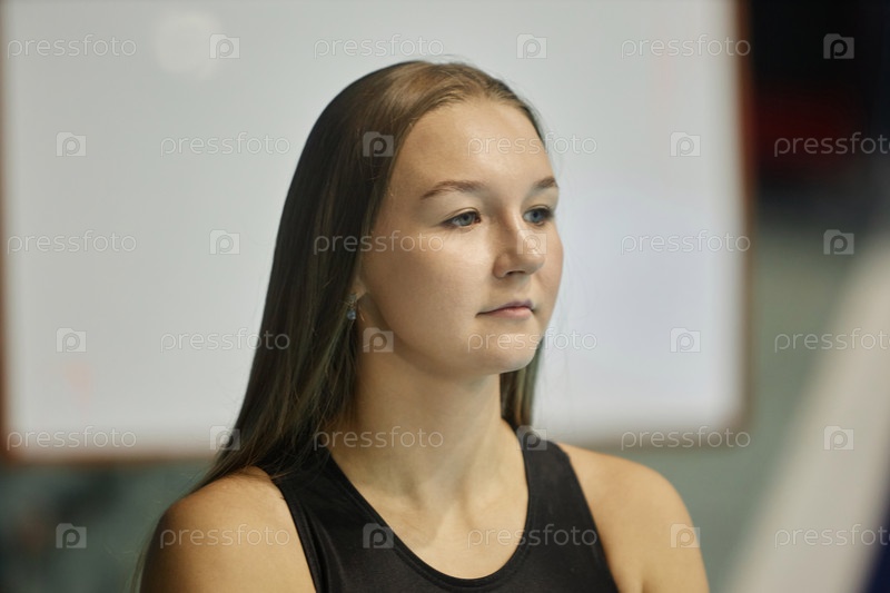Молодая безмятежная купальница с длинными прямыми волосами, смотрящая вперед