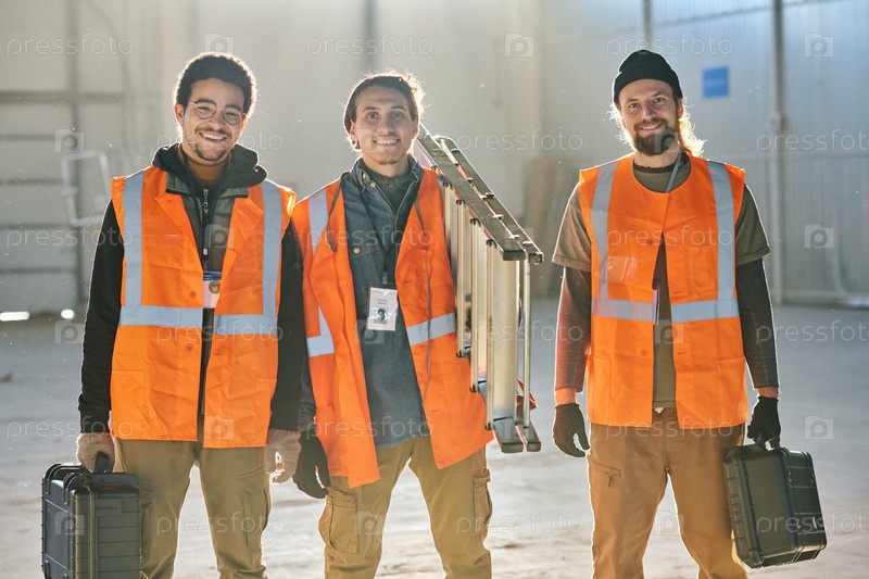 Группа молодых успешных инженеров промышленного завода или склада